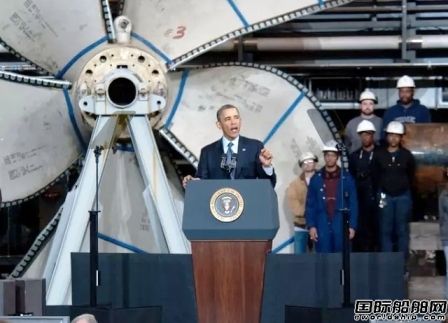 2013年2月26日,奧巴馬總統訪問紐波特紐斯造船廠,他的身后是福特號航母的推進器,旁邊是一艘弗吉尼亞級核潛艇的艇首艙。